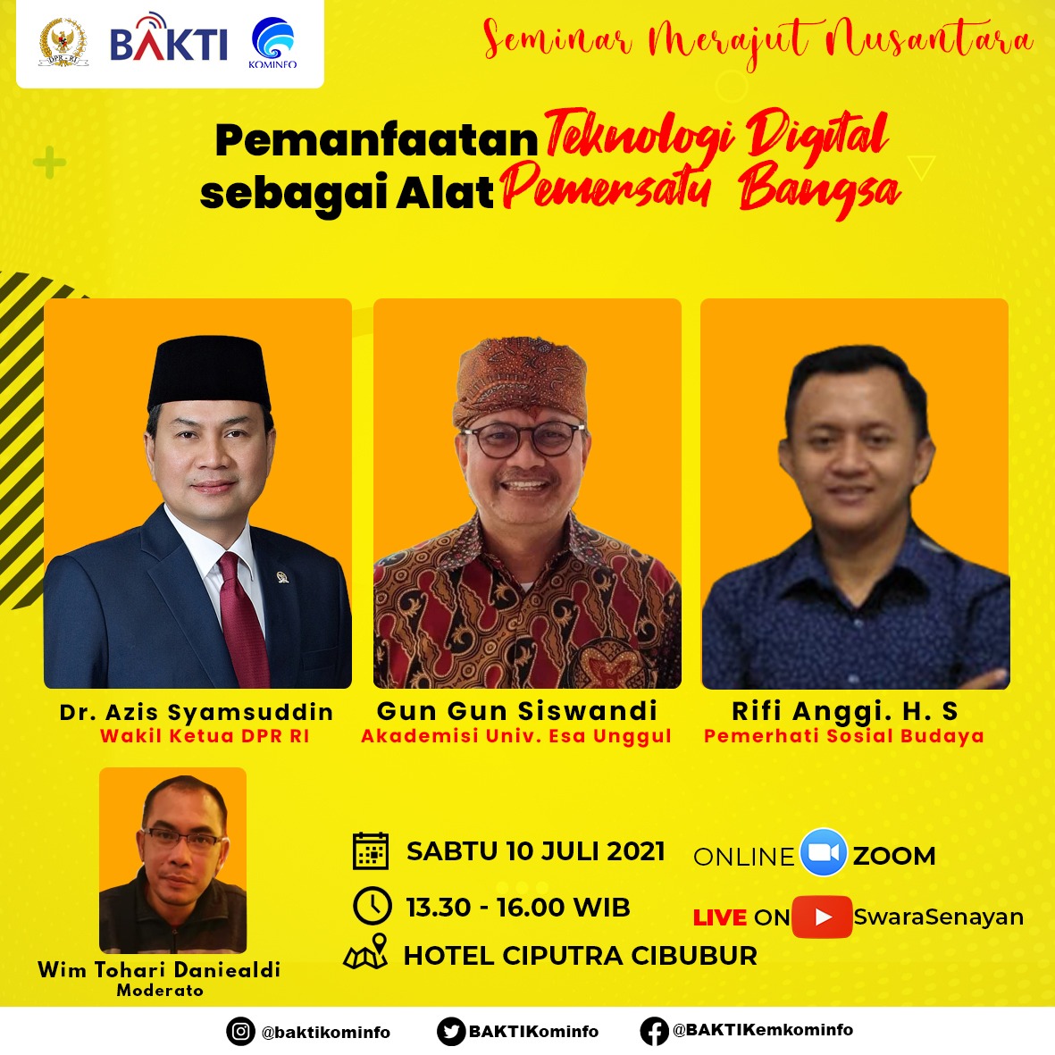 Hal itu disampaikan Azis Syamsuddin pada saat ia menjadi narasumber pada acara Seminar Merajut Nusantara yang digelar oleh Badan Aksesibilitas Telekomunikasi dan Infomasi (BAKTI Kominfo) dengan tema “Pemanfaatan Teknologi Digital Sebagai Alat Pemersatu Bangsa”, yang dilakukan secara live melalui Zoom Cloud Meeting dan live channel youtube Swara Senayan di Jakarta pada Sabtu (10/07/2021).