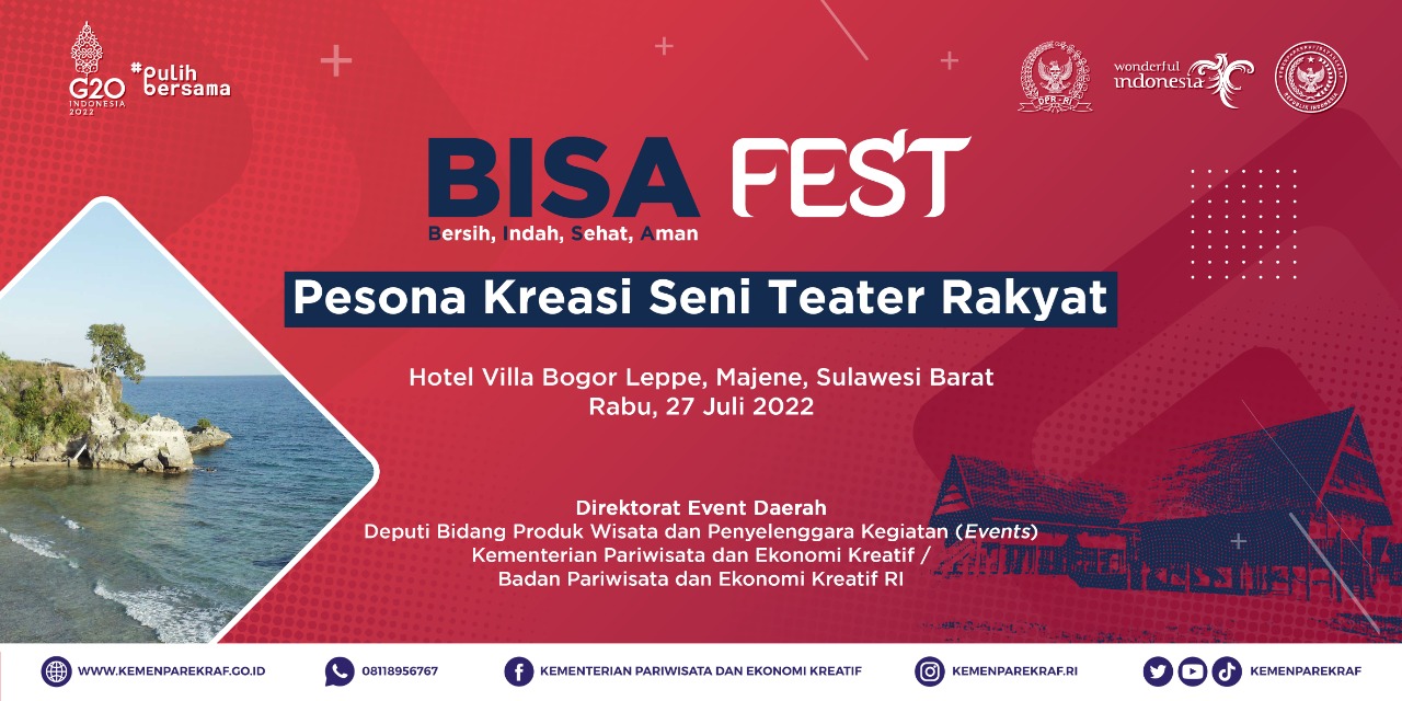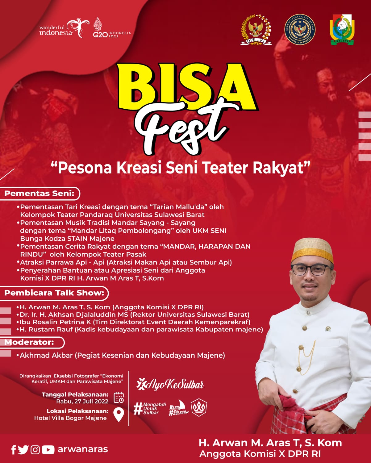 Selanjutnya pada hari Rabu tanggal 27 Juli 2022 di Kabupaten Majene, akan digelar kegiatan Bisa Fest dengan tema “Pesona Kreasi Seni Teater Rakyat” yang melibatkan kelompok-kelompok teater di Majene. Kegiatan ini juga dirangkaikan pameran foto dari beberapa komunitas fotografi yang ikut berpartisipasi pada kegiatan tersebut.
