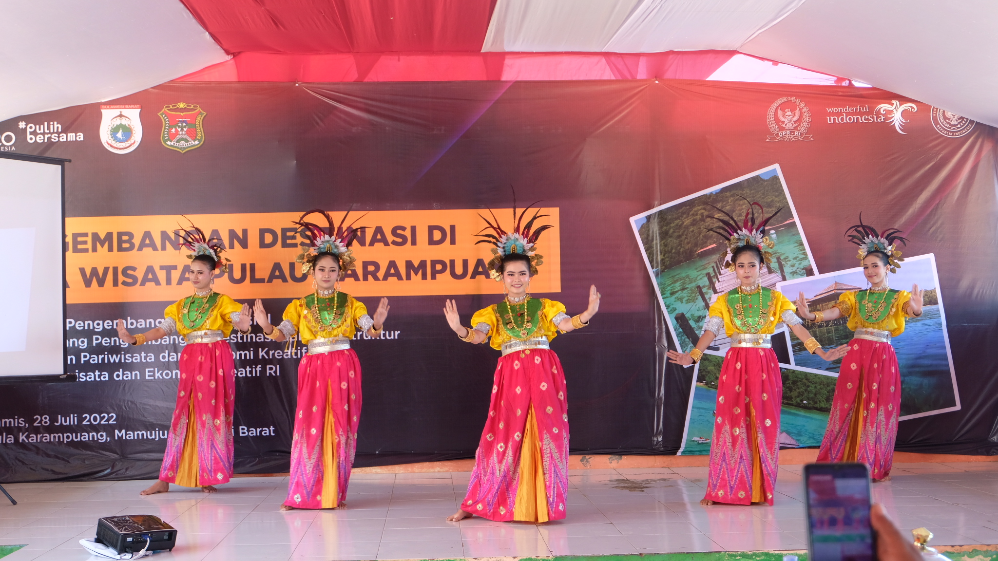 Kegiatan Desa Wisata Pulau Karampuang ini dimeriahkan dengan Pementasan Seni Tari “Paindo Diliutang” oleh Sanggar Tari Dewan Kesenian dan Kebudayaan Mamuju (DKKM) diiringi oleh Tim Music DKMM. Menjadi peserta dalam kegiatan ini adalah kelompok masyarakat dan pelaku pariwisata yang bertujuan meningkatkan kapasitas sumber daya manusia dalam pelayanan di Desa Wisata Karampuang.