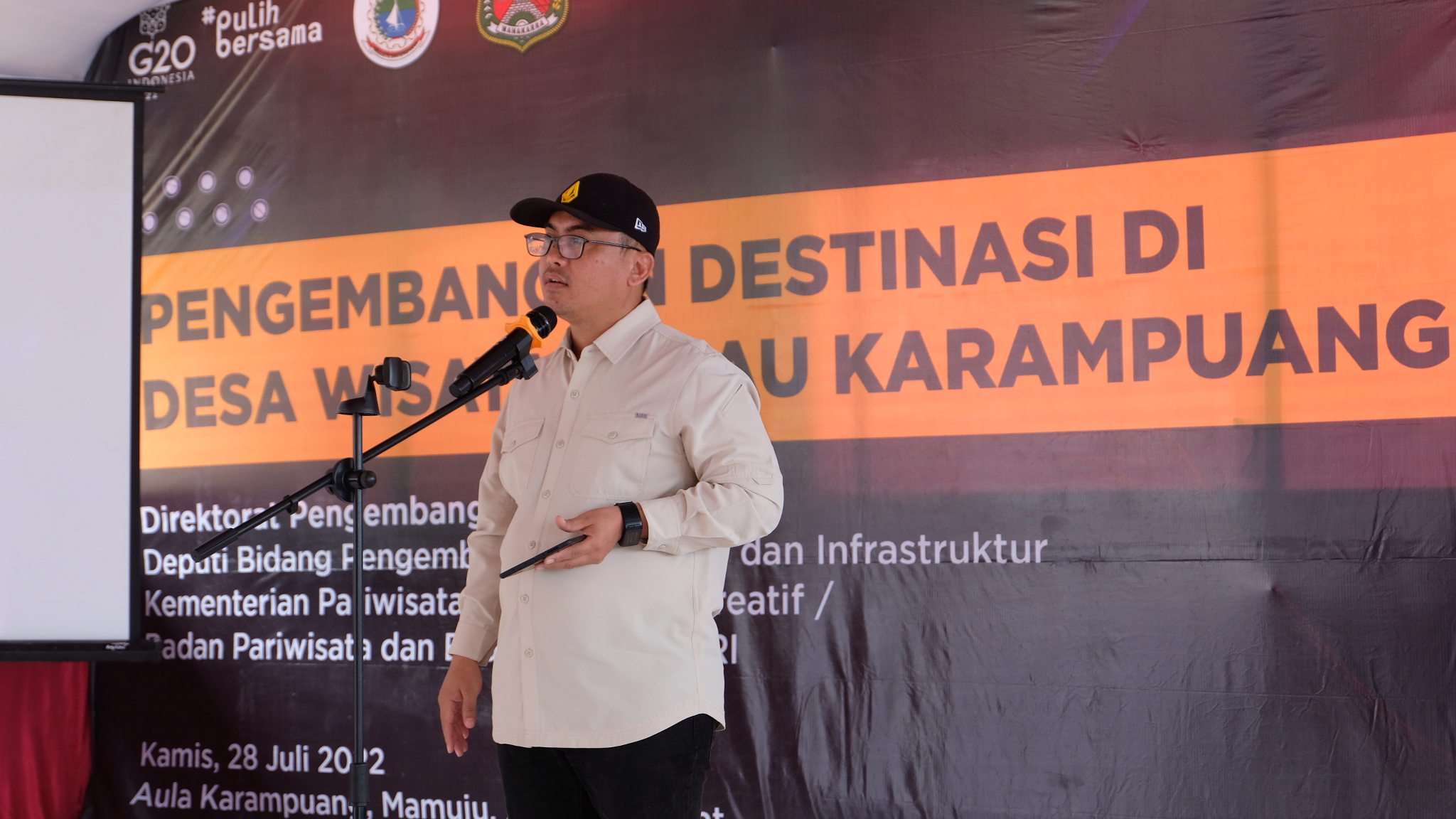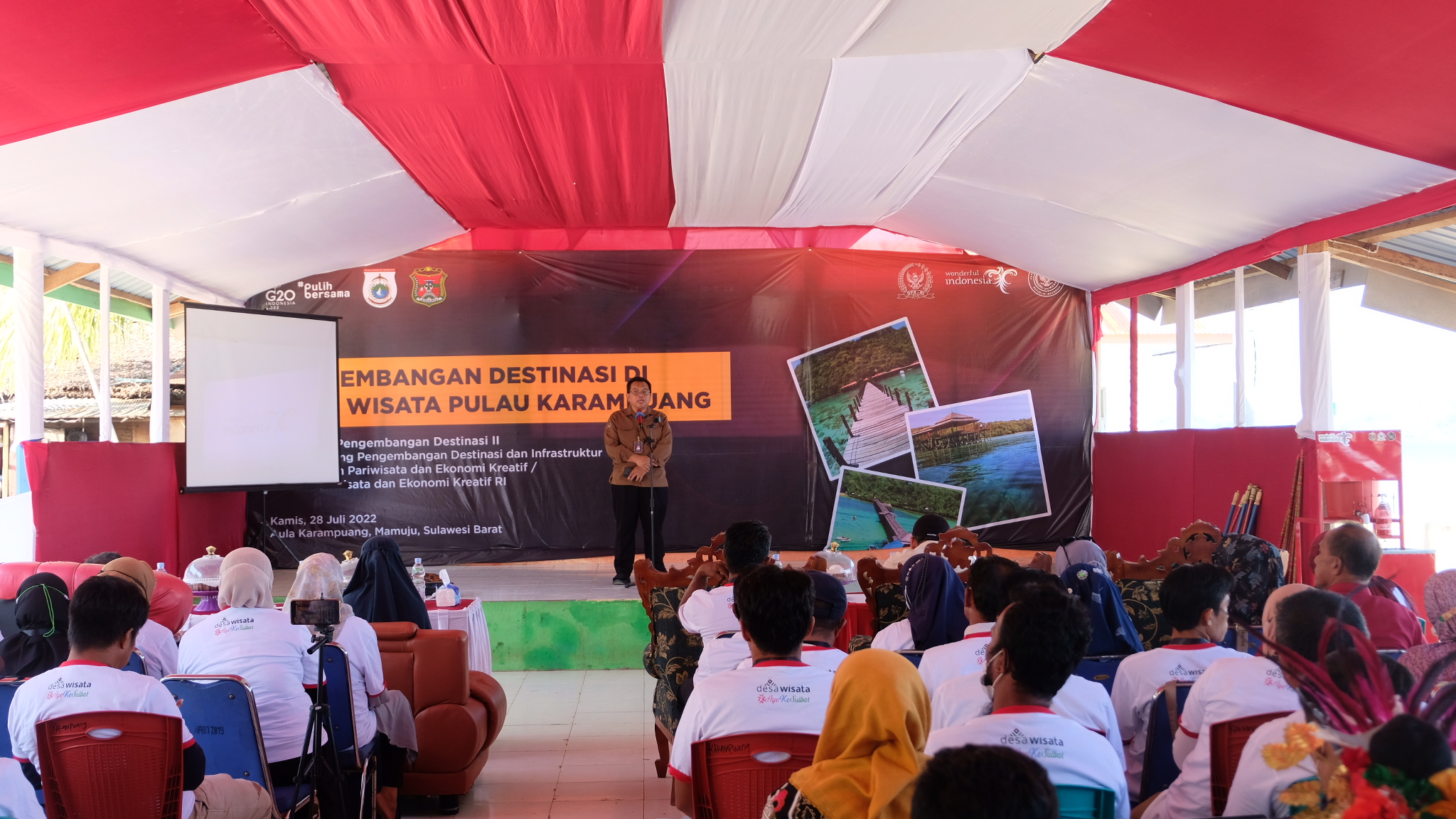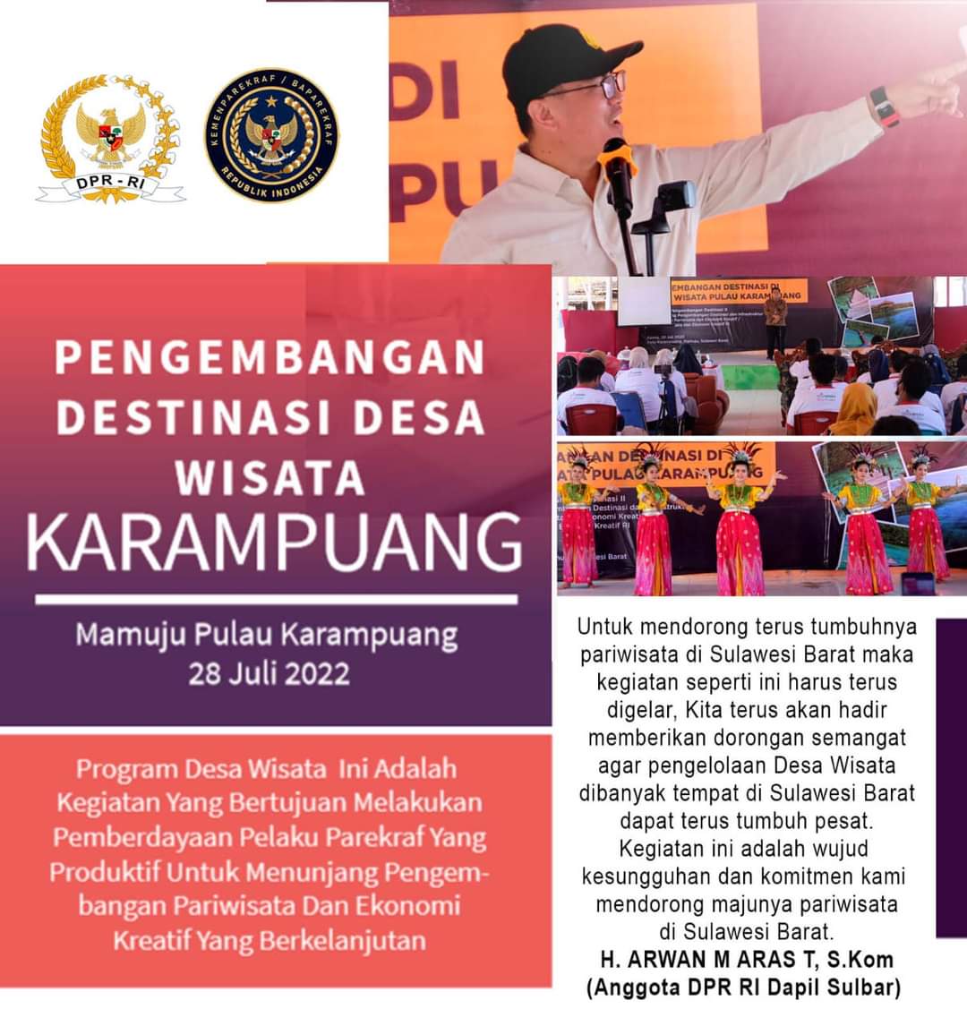 SwaraSenayan.com – Sebagai upaya peningkatan kualitas desa wisata untuk menciptakan ekosistem Desa Wisata Mandiri yang berkelanjutan secara ekonomi, sosial, budaya dan lingkungan maka Anggota Komisi X DPR RI Dapil Sulawesi Barat H. Arwan M. Aras T, S.Kom bersama Kementerian Pariwisata dan Ekonomi Kreatif (Kemenparekraf) yang diwakili oleh Direktorat Pengembangan Destinasi II mengadakan kegiatan Desa Wisata Pulau Karampuang dengan tema “Pengembangan Destinasi di Desa Wisata” di Aula Desa Karampuang, Kecamatan Mamuju, Kabupaten Mamuju, Provinsi Sulawesi Barat (Sulbar) pada Kamis (28/07/2022).