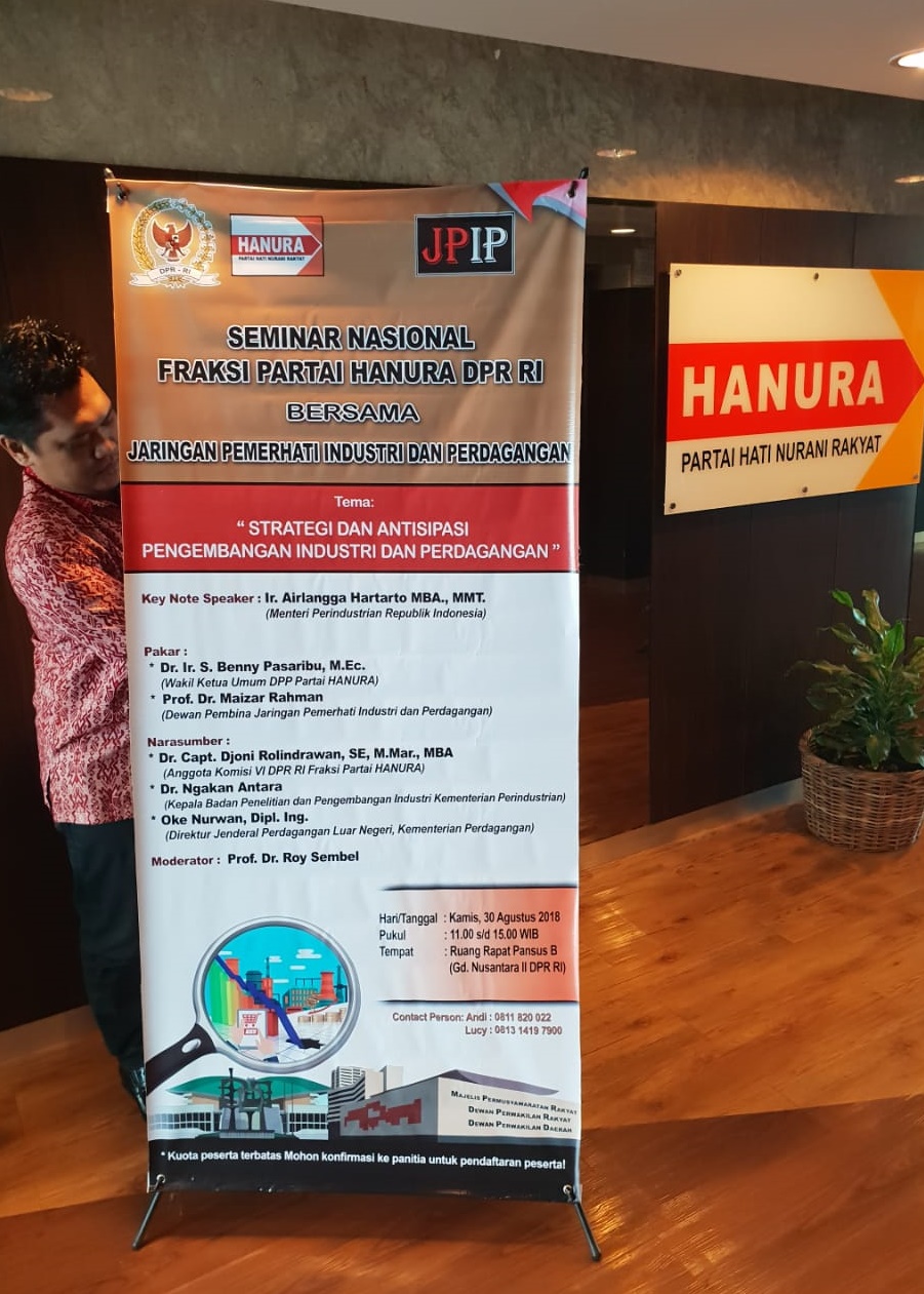 SwaraSenayan.com –  Fraksi Partai Hanura DPR RI akan mengadakan Seminar Nasional bersama Jaringan Pemerhati Industri dan Perdagangan (JPIP) pada Kamis, 30 Agustus 2018 di Ruang KK II DPR RI, Senayan.