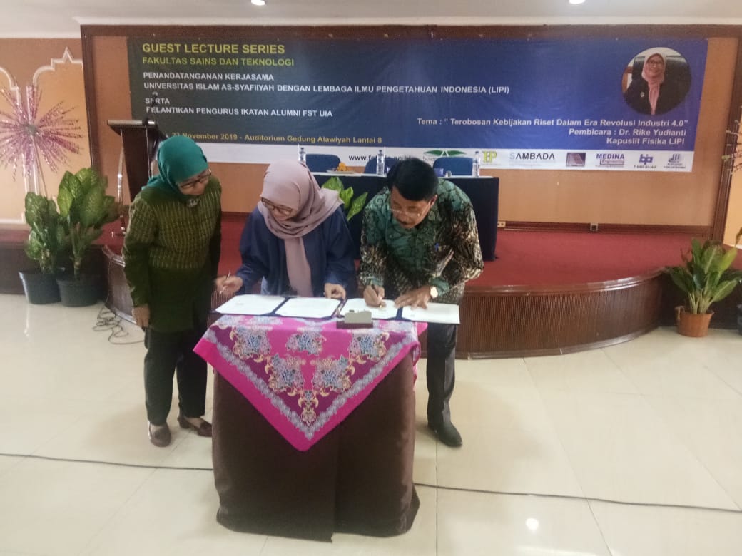 Untuk pemberdayaan terciptanya SDM unggul, seusai memberikan kuliah umum, Dr. Rike Yudianti mewakili LIPI melakukan penandatangan kerjasama penelitian dengan Dr. Indaryani, M.Sc. selaku Dekan FST UIA dan Dr Masduki Ahmad selaku Rektor UIA. *mtq
