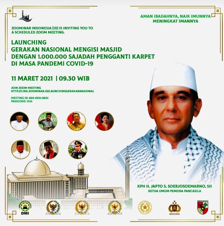 “Saya mendukung inisiatif Majelis Pimpinan Nasional Pemuda Pancasila untuk memanfaatkan masjid tidak hanya sebagai sarana ibadah, tetapi juga menjadi sarana pendidikan dan pembinaan umat, termasuk dalam hal pencegahan dan penanganan risiko bencana, khususnya pandemi Covid-19,” ujar Wapres saat meresmikan Gerakan Nasional Mengisi Masjid Dengan 1.000.000 Sajadah Pelindung Covid-19, Kamis (11/3/2021).