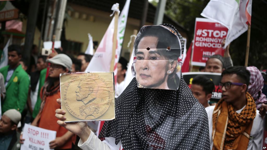 A Muslim woman wears a mask of Myanar's Foreign Minister Aung San Suu Kyii during a rally against the persecution of Rohingya Muslims, outside the Embassy of Myanmar in Jakarta, Indonesia, Friday, Nov. 25, 2016. The Myanmar government does not recognize the Rohingya as citizens, though they have lived in the country for generations. Persecution of Rohinyga has escalated in the past several years and they face violence instigated by Buddhist hardl-iners and institutionalized discrimination. (AP Photo/Dita Alangkara)