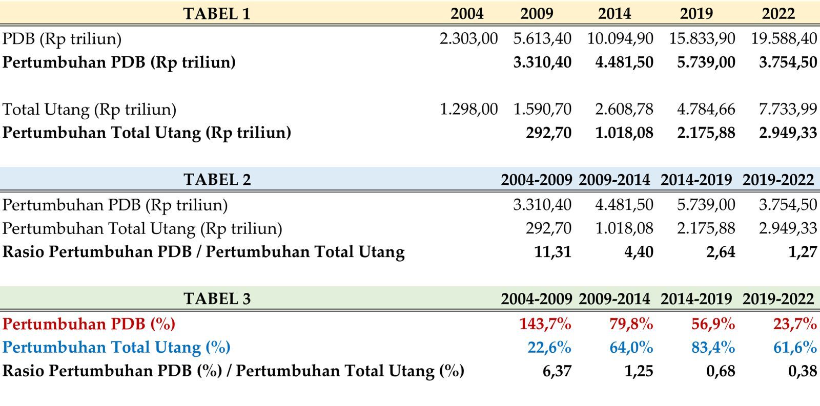 Terakhir, keempat, Sri Mulyani seharusnya membandingkan kenaikan PDB nominal dengan kenaikan utang, dalam persentase, seperti pada tabel 3. Ternyata, rasio ini pada periode 2019-2022 sangat rendah, hanya 0,38. Artinya, setiap kenaikan 1 persen utang hanya membuat PDB nominal naik 0,38 persen. Sedangkan di periode 2004-2009, setiap kenaikan 1 persen utang membuat PDB nominal naik 6,37 persen.