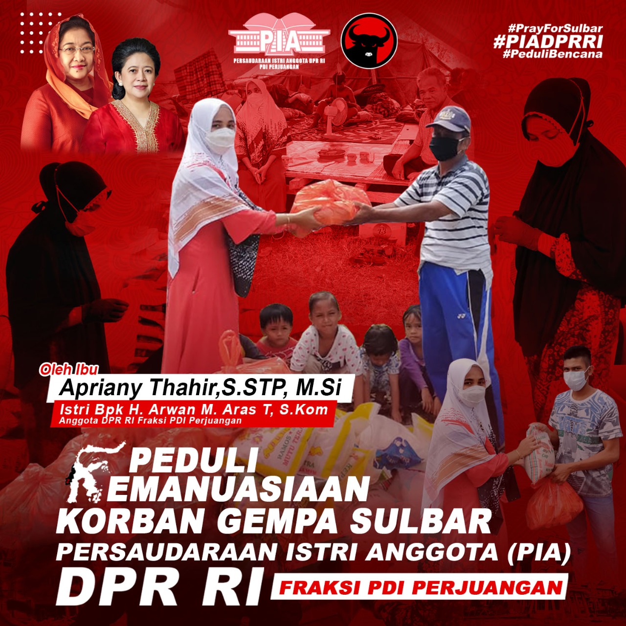 SwaraSenayan.com – Persaudaraan Isteri Anggota (PIA) DPR RI Periode 2019-2024 Fraksi Partai Demokrasi Indonesia Perjuangan (PDI-P) menggelar kegiatan Peduli Korban Gempa Sulbar dan menyambangi korban bencana di Kabupaten Majene dan Kabupaten Mamuju, Provinsi Sulawesi Barat. Kegiatan PIA DPR RI Fraksi PDI-P tersebut menyalurkan bantuan 600 paket kebutuhan pokok yang berisi beras 5 kg, minyak, susu, kopi, gula, indomie, softex per paketnya. Di Kabupaten Mamuju bantuan tersebut disalurkan di Kecamatan Tapalang dan Kecamatan Tapalang Barat. Sedangkan di Kabupaten Majene bantuan dari PIA DPR RI itu disalurkan di Kecamatan Malunda.