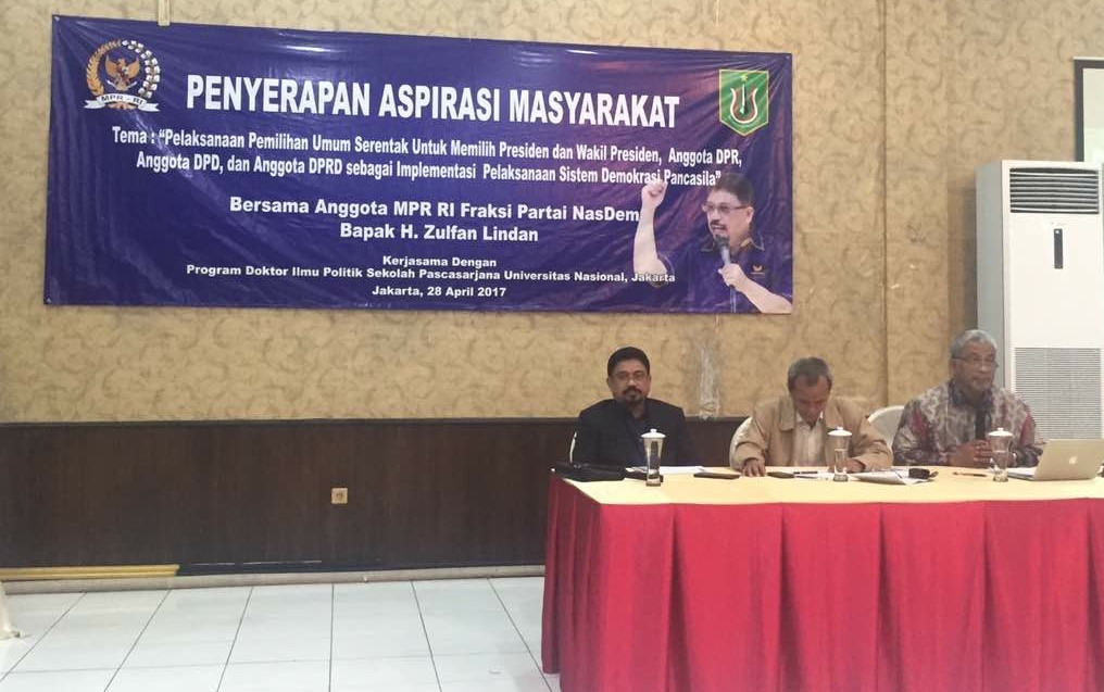 Demikian dipaparkan Dr. TB Massa Djafar pada Diskusi Tentang Penyelenggaraan Pemilu Serentak (Pileg, DPD, Presiden, DPRD) Sebagai Implementasi Demokrasi Pancasila di Restoran Raden Bahari Jakarta (28/4/2017). Acara ini terselenggara atas kerjasama Sekolah Pasca Sarjana Universitas Nasional Program Doktoral Ilmu Politik dengan MPR RI. Hadir dari perwakilan MPR adalah politisi Partai Nasdem H. Zulfan Lindan.