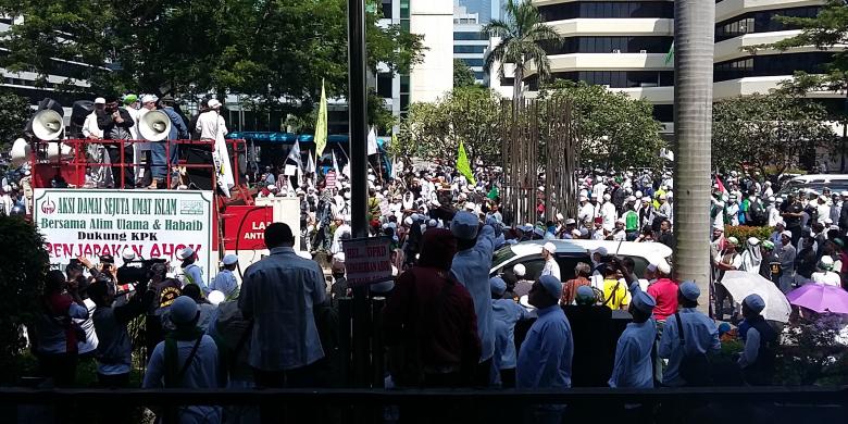 SwaraSENAYAN.com. Ratusan orang dari ormas Front Pembela Islam (FPI) berunjuk rasa di depan Gedung Komisi Pemberantasan Korupsi (KPK). Dalam aksinya mereka menuntut pimpinan KPK segera memanggil Gubernur DKI Jakarta, Basuki Tjahaja Purnama, terkait sejumlah kasus yang diduga beraroma korupsi.
