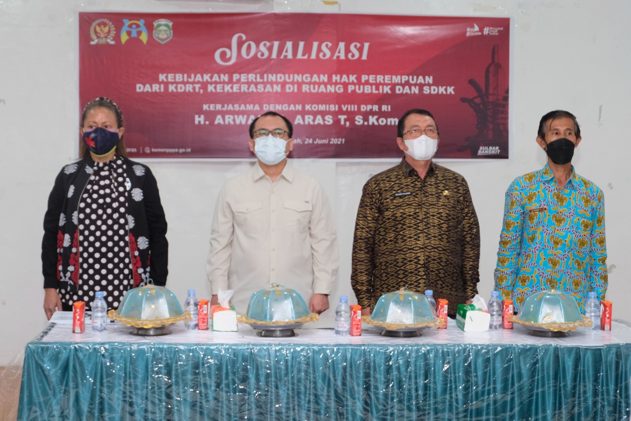 Sosialisasi berlangsung di aula Wisma Bahari Indah Topoyo, Kamis (24/6/2021) dihadiri oleh, Anggota DPR RI Komisi VIII, H. Arwan M Aras T, S.Kom, Kementrian PPPA, Iche Margareth Robin, Kadis PPPA Prov. Sulbar, Hj. Djamila, Asisten Bidang Administrasi Umum Setda Mamuju Tengah, Colleng Sulaiman, Kabid KB Dinas PPPA Mamuju Tengah, Dansis Wahyu Wibowo, serta Kabid Ekonomi Sosial Dan Budaya BAPPEDA Kab. Mamuju Tengah, Hairullah, S.Pd.