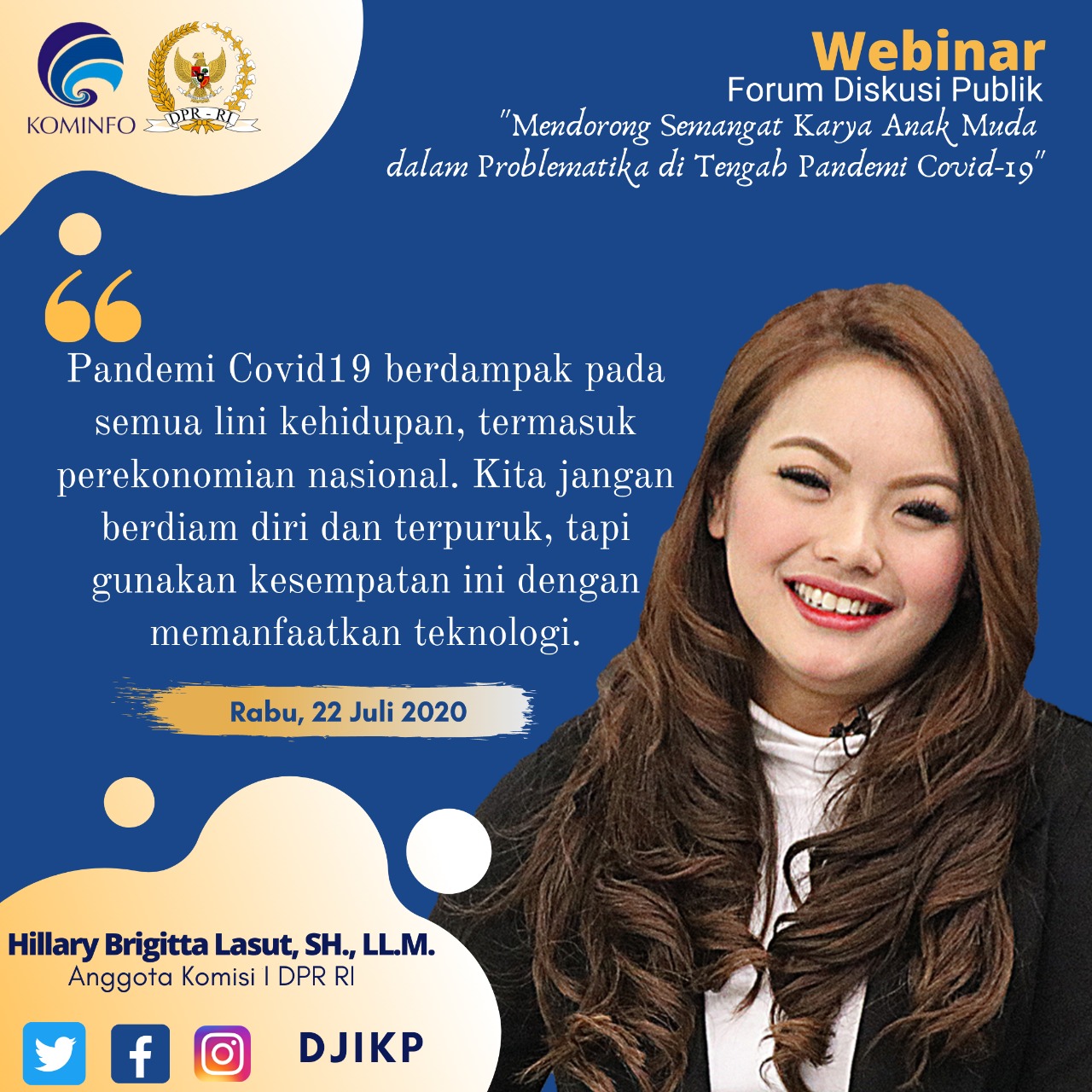 SwaraSenayan.com. Anggota Komisi I DPR, Hillary Brigitta Lasut, SH., LL.M, politisi Partai NasDem dari Dapil Sulawesi Utara menyatakan bahwa anak muda masih bisa tetap produktif di tengah masa pandemi virus Corona (Covid-19). Menurut dia, pandemi Covid-19 tidak hanya berdampak pada bidang kesehatan, melainkan ekonomi nasional. Banyak usaha masyarakat terkendala karena harus tetap berada di rumah, pemotongan gaji, hingga pemutusan hubungan kerja (PHK).