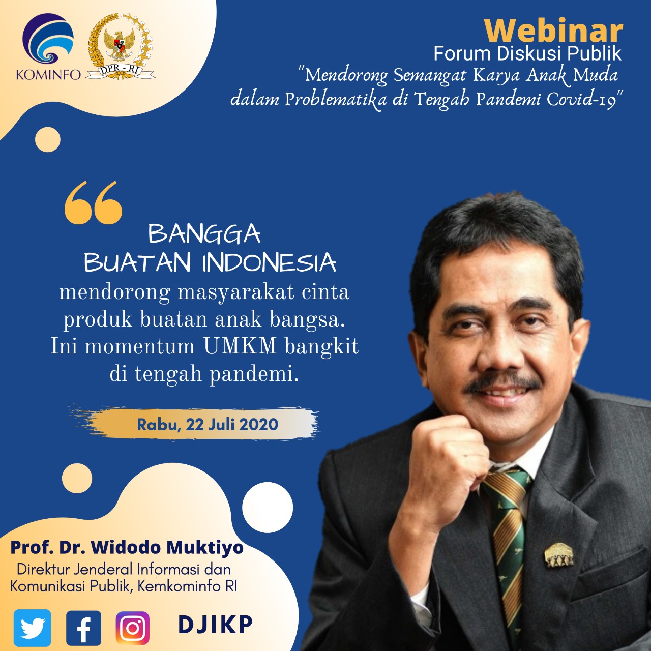 “Kita mesti menumbuhkan kebanggaan produksi saudara saudara kita, agar implikasinya menumbuhkan ekonomi-ekonomi pelaku UMKM,” ujar Prof. Dr. Widodo Muktiyo selaku Dirjen Inofomasi dan Komuniksi Publik Kementerian Kominfo RI dalam Webinar dengan tema ‘Mendorong Semangat Karya Anak Muda dalam Problematika di Tengah Pandemi Covid-19”, Rabu, (22/7/2020).
