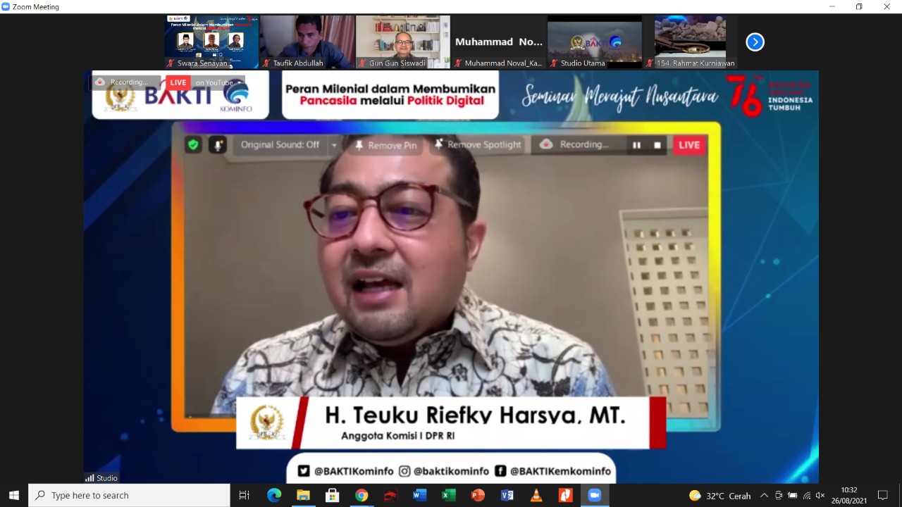 Demikian disampaikan oleh Anggota Komisi I DPR RI, H. Teuku Riefky Harsya, MT selaku narasumber pada Seminar Merajut Nusantara yang digelar oleh BAKTI KOMINFO RI dengan tema “Peran Milenial dalam Membumikan Pancasila melalui Politik Digital, secara virtual, Jakarta (26/08/2021).
