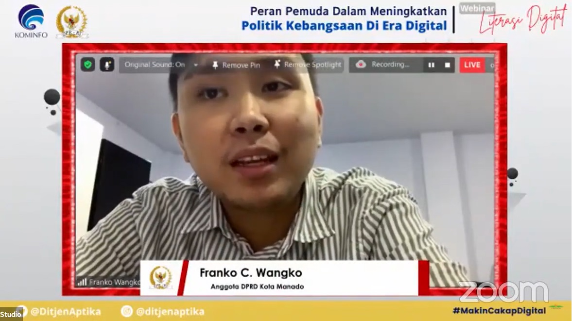 Sementara itu paparan terakhir disampaikan oleh Franko C. Wangko selaku Anggota DPRD Manado. Ia menyampaikan bahwa peran pemuda dalam politik kebangsaan tidak dapat dinafikan. Peran itu terceritakan dalam berbagai sejarah bangsa, bertalian dan berkaitan satu sama lainnya.