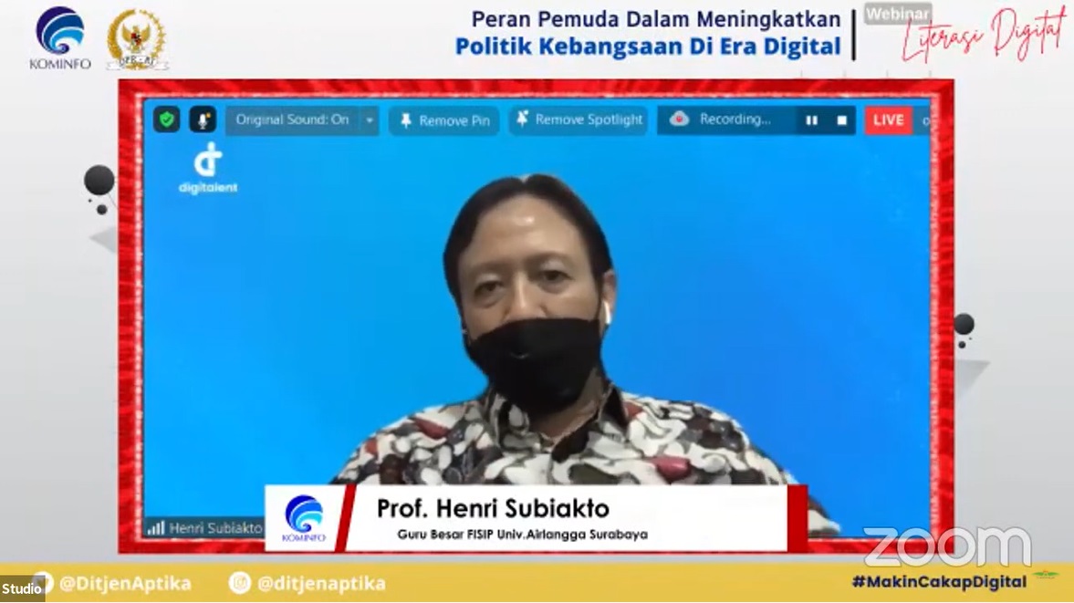Paparan kedua disampaikan oleh Guru Besar FISIP Universitas Airlangga Surabaya, Prof. Henri Subiakto. Ia menyampaikan, keberagaman masyarakat Indonesia perlu diimbangi dengan politik kebangsaan yang berorientasi pada persatuan Indonesia dengan Bhinneka Tunggal Ika. Dan kehadiran teknologi mengharuskan masyarakat terutama pemuda untuk menjaga ruang digital tetap demokratis berdasar prinsip-prinsip kebangsaan.
