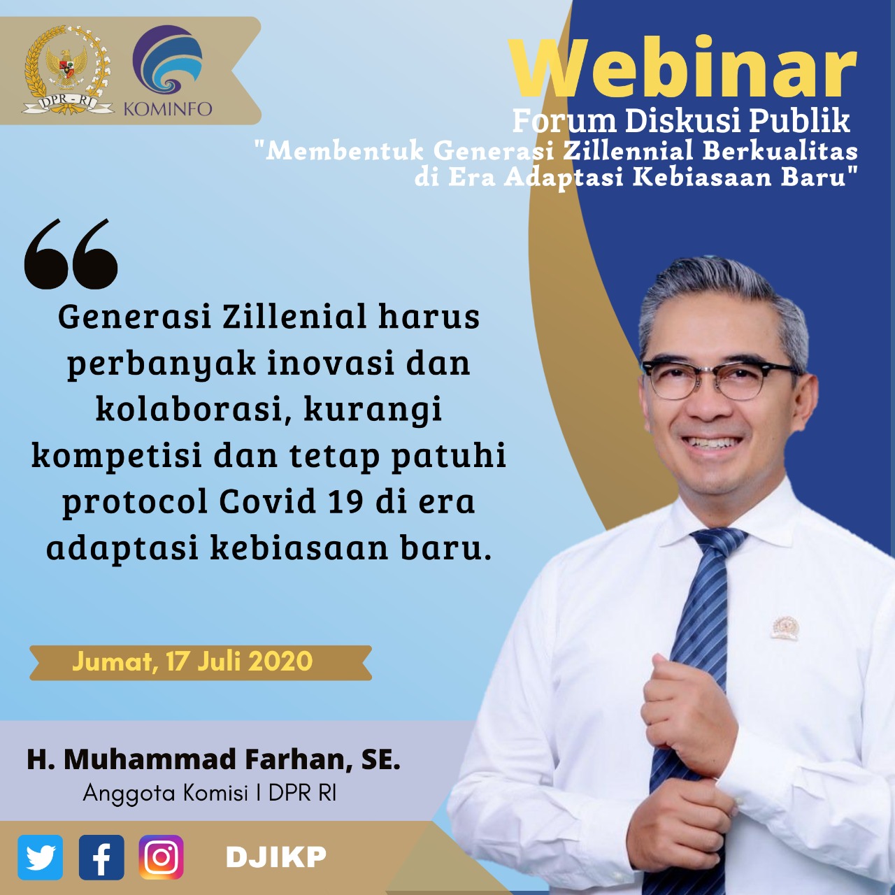 Demikian disampaikan H. Muhammad Farhan, SE selaku Anggota Komisi I DPR pada acara Webinar dengan tema: Membentuk Generasi Zillenial Berkualitas di Era Adaptasi Kebiasaan Baru, dengan Direktorat Informasi dan Komunikasi Publik Kementerian Komunikasi dan Informatika (Ditjen IKP Kemenkominfo RI) melalui Zoom Cloud Meeting, pada Jum’at (17 Juli 2020).