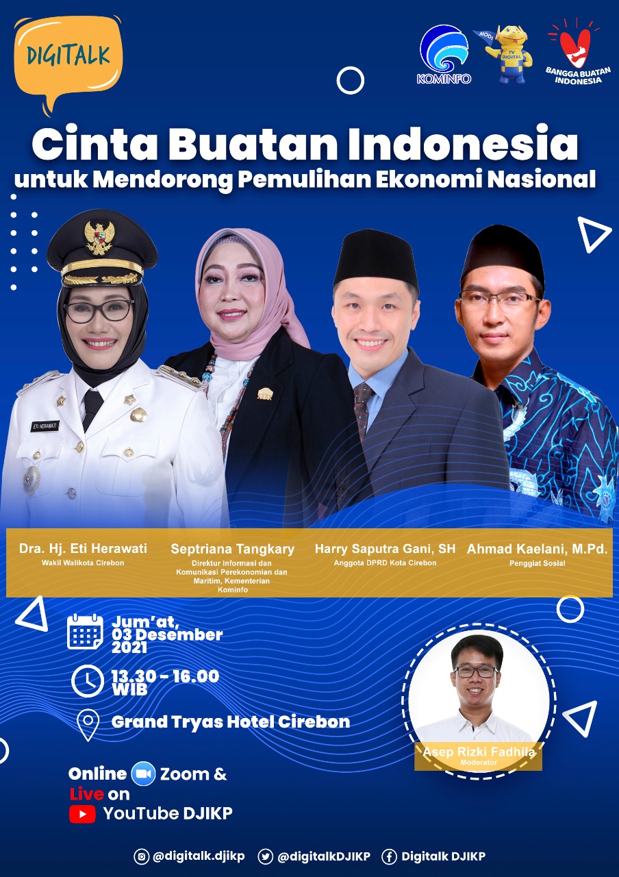Kementerian Komunikasi dan Informatika (Kemkominfo) melalui Direktorat Jenderal Informasi dan Komunikasi Publik mengajak masyarakat agar mencintai produk buatan Indonesia untuk mendorong pemulihan ekonomi nasional melalui Forum Digitalk Kominfo dengan mengangkat tema “Cinta Buatan Indonesia untuk Mendorong Pemulihan Ekonomi Nasional” disiarkan langsung dari Grand Tryas Cirebon yang diikuti oleh peserta secara daring dan luring, Jum’at (03/12/2021).